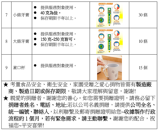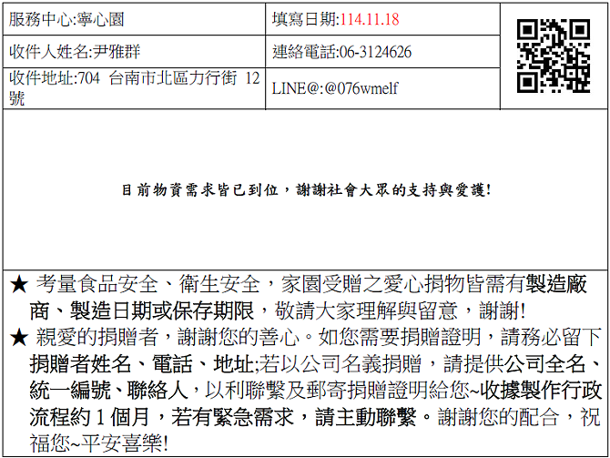 請捐贈人(特別是透過網購或店家直接下單送貨者)記得於寄件資料中留下連絡電話,以便我們回覆聯繫。