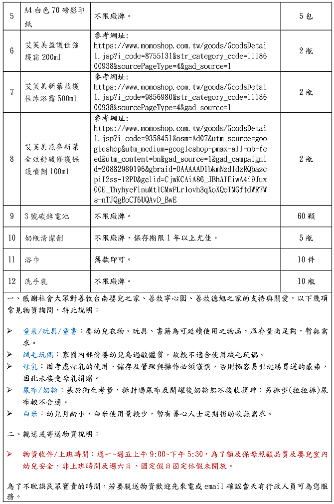 親送:我們的上班時間是周一至周五9:00~17:30,然而因人力有限,為了不耽誤您寶貴的時間,若有要親送物資的民眾,歡迎先來電確認人員在現場可以為您服務。煩請致電06-2344009進一步確認。